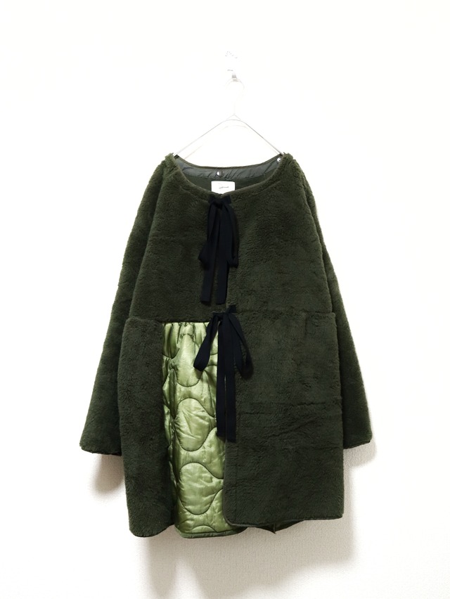 vintageのミリタリーボアライナーと キルティングライナーをドッキング リメイクして作ったコートです。 身幅はリボンで調整できるので お好みの広さで着るとこができます。 メンズのコートをリメイクしているので 比較的ゆったりで厚めのニットやスウェット などを着ていてもゆるっと着ていただけます。 キルティングアイテムはほつれている場合が ございますが、経年劣化としてお楽しみ頂ける 方のみご購入お願い致します。 ____________________ 着丈 約86cm 身幅 約70cm 袖幅 約23cm ラグラン 約74cm ⚪︎平置きでの採寸です ____________________ こちらはリメイク商品です リメイク商品はすべて古着を使用している為、 シミや汚れや小さな穴などがある場合がございます 古着を解体している為、ほどいた際の穴ができたり 稀に糸が残っている場合がございます 色落ちしてくる可能性がございます 切りっぱなしアイテムの為最初のお洗濯では 素材が少し出てくる可能性があります ご自宅で洗濯していただく際は洗濯用ネットに入れて、 単体でのお洗濯をオススメいたします またハンドメイドで一点ずつ手作りしていますので既製品の ように完璧な品物ではございません できる限りクリーニングや手直ししてからリメイクしていますが、 柔軟剤など匂いが強く気になる場合がございます 古着へのご理解の無い方、匂いに敏感な方は 購入をお控えくださいませ すべて一点もので愛情を込めてお作りしております あらかじめご了承くださいませ